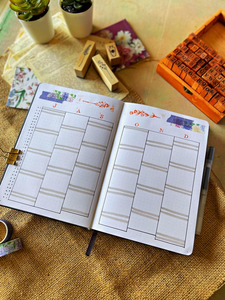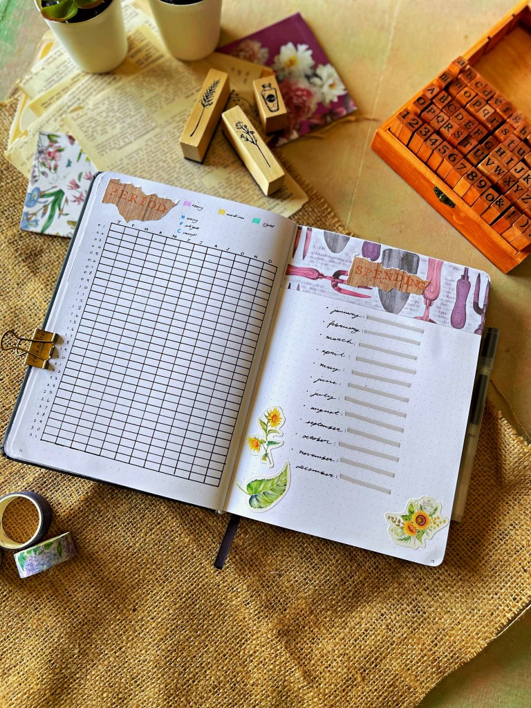 - Period tracker: I use a digital app to track my periods and symptoms but I also wanted an analogue representation in my bullet journal to track dates, basic symptoms and flow.