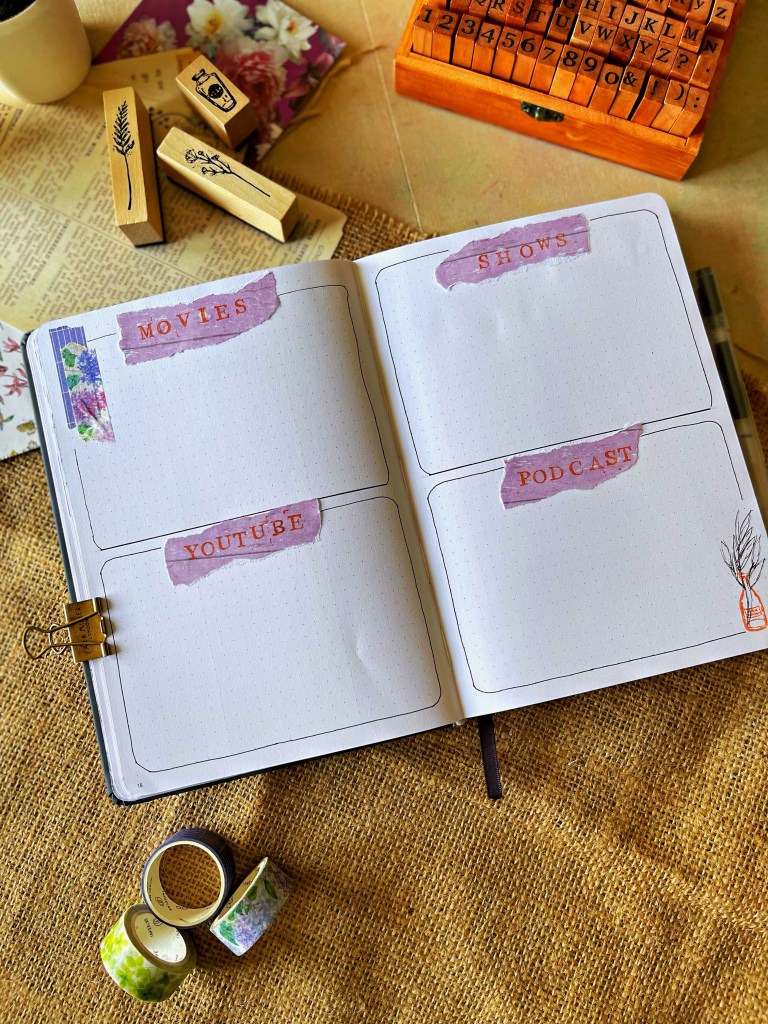 - Movies/TV Shows/YouTube/Podcasts: A spread to note down the media I consume throughout the year. This a space to only jot down the name and any further details can be made in new spreads or in the daily log.