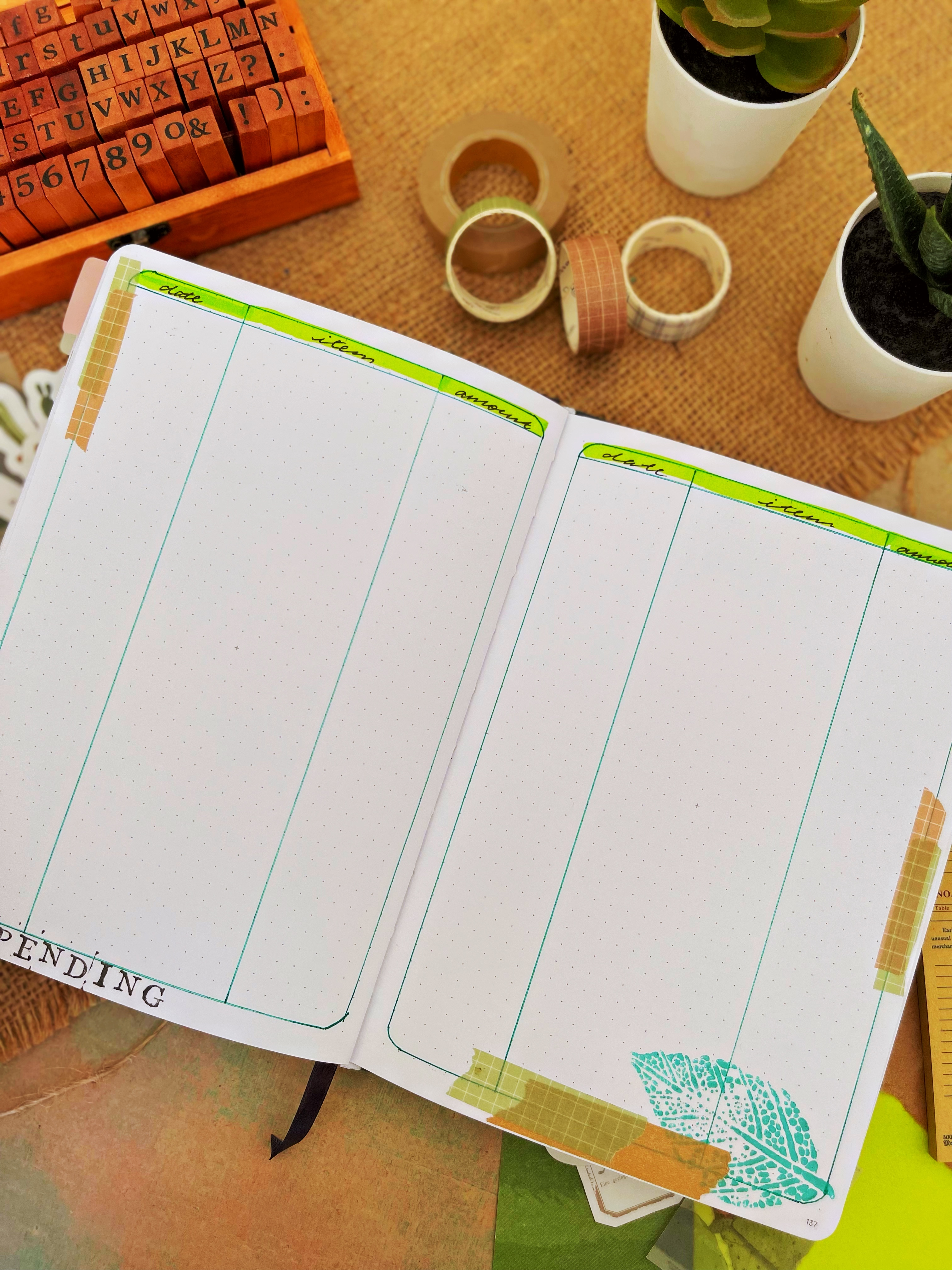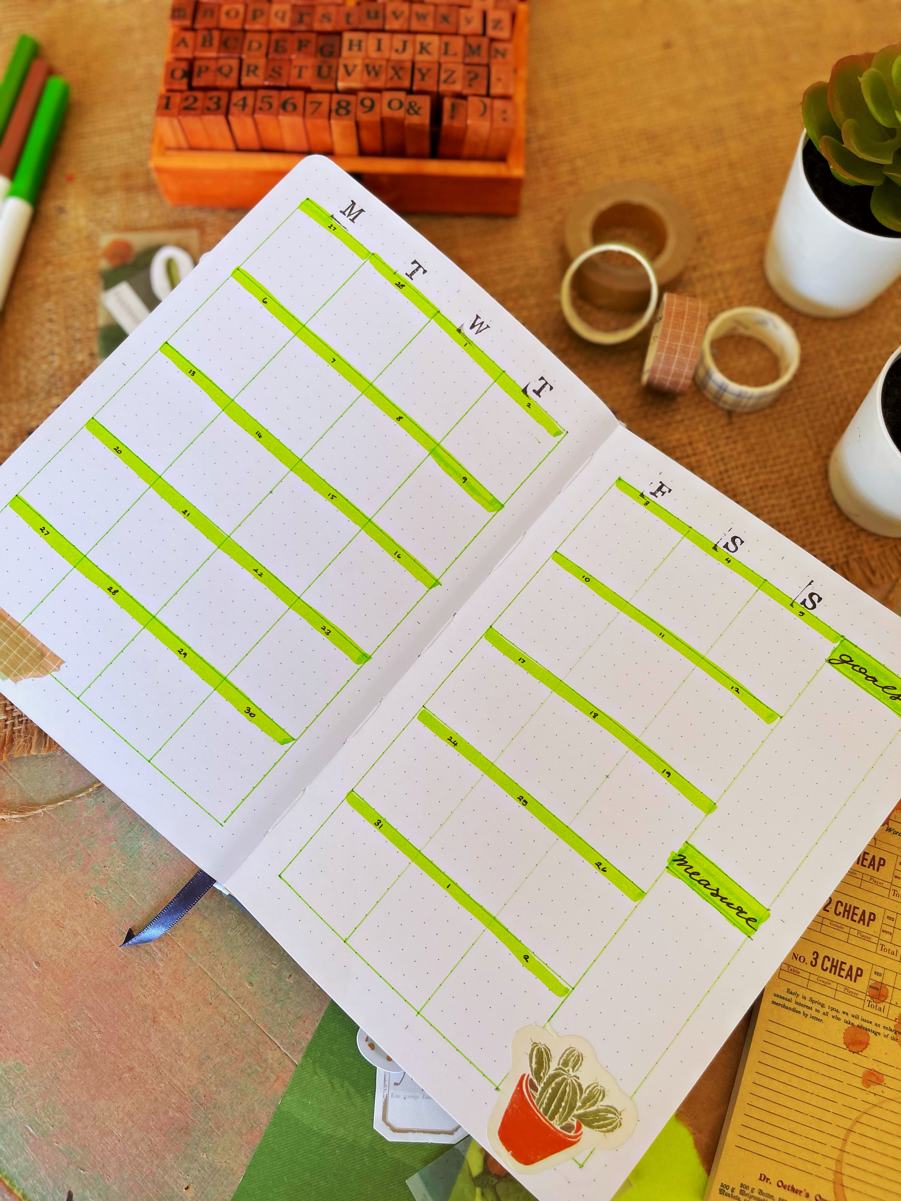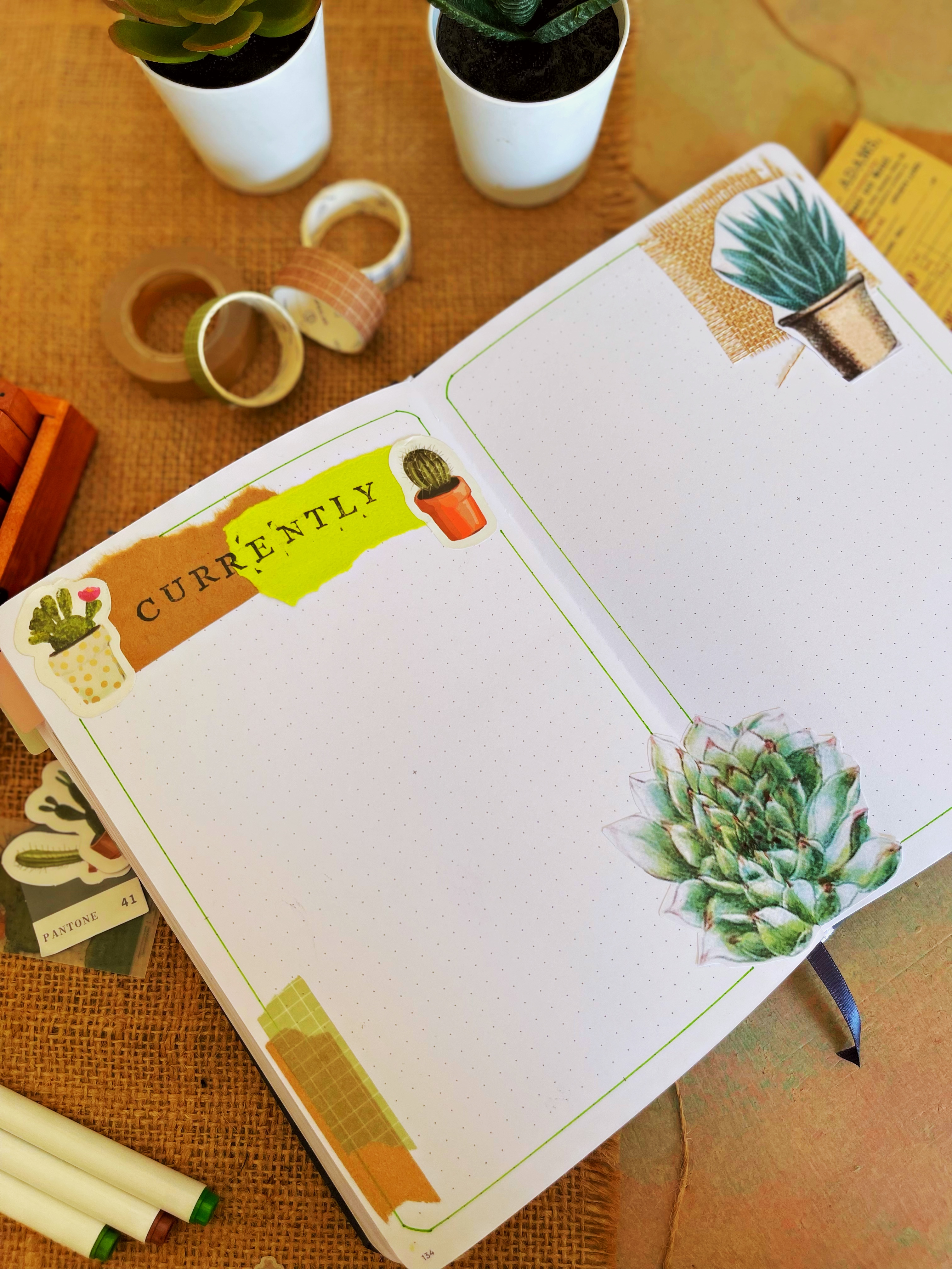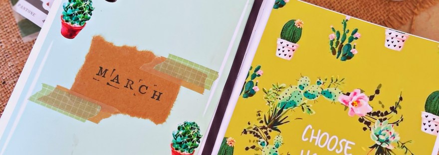 My theme for March is cactuses and craft paper. Inspired by some packaging I received earlier in the month and my love for alliteration. The green really makes the pages sing and I feel excited looking at it with that strong promise of spring time.