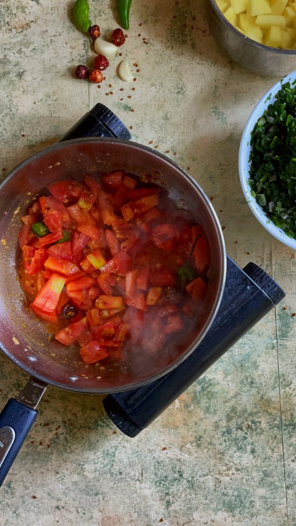 - Add diced tomatoes, salt, turmeric pwd and chilli flakes. Stir fry until the oil separates.